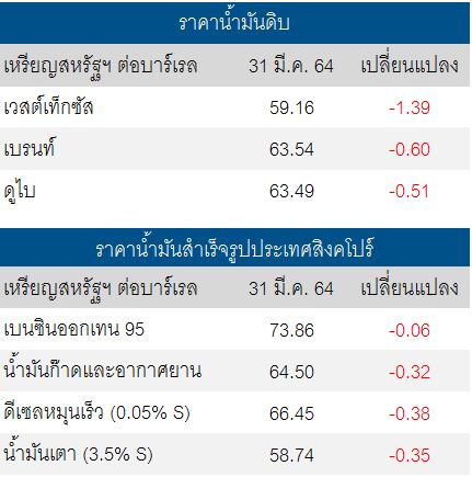 – ราคาน้ำมันดิบเวสต์เท็กซัสและเบรนท์ปรับลด จากความกังวลที่เพิ่มขึ้นต่อการฟื้นตัวของอุปสงค์น้ำมัน หลังประธานาธิบดีฝรั่งเศสประกาศใช้มาตรการล็อกดาวน์ทั่วประเทศเป็นครั้งที่ 3 โดยการจำกัดการเดินทาง ปิดร้านค้าที่ไม่สำคัญ ในกรุงปารีสและในบางพื้นที่ทางภาคเหนือและภาคใต้ของประเทศ รวมถึงประกาศปิดโรงเรียนทั่วประเทศเป็นเวลา 3 สัปดาห์ เพื่อควบคุมการแพร่ระบาดของเชื้อไวรัสโควิด-19 ที่ทวีความรุนแรงมากขึ้น