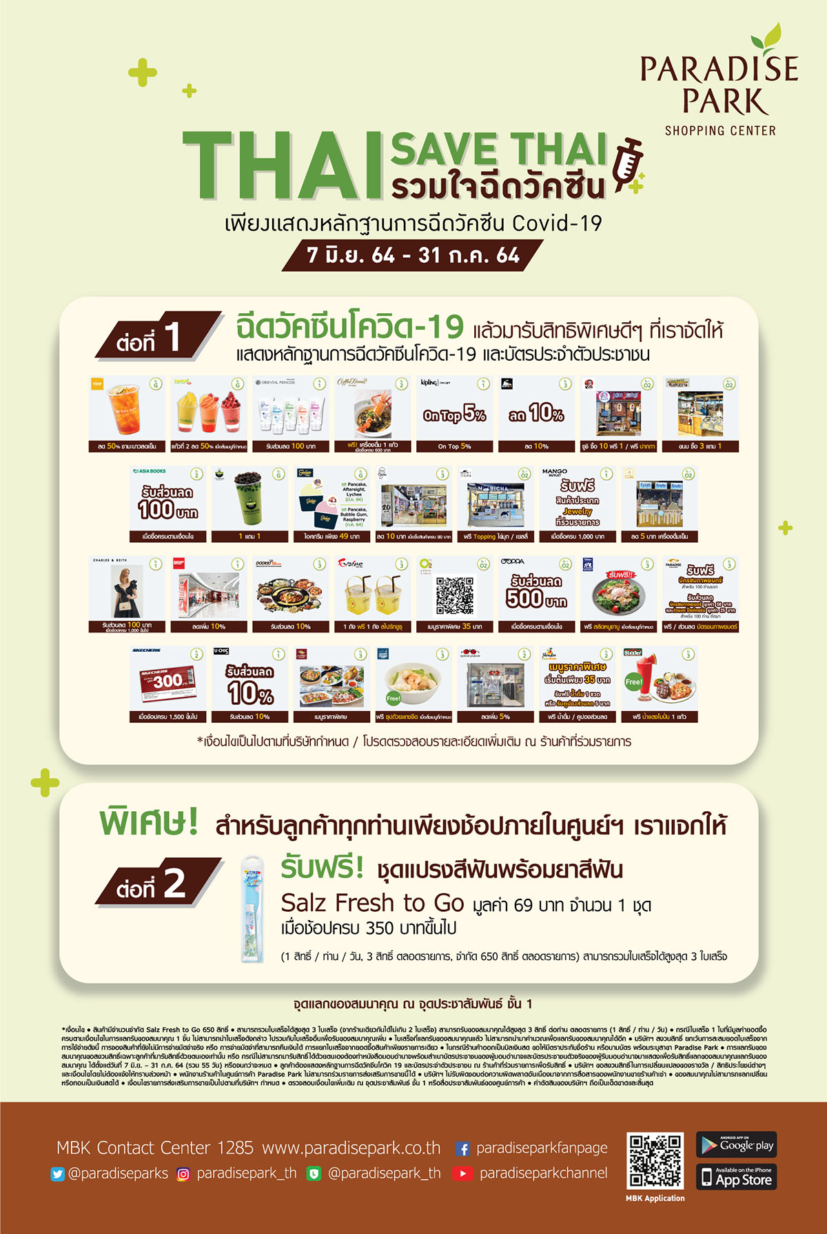 พาราไดซ์ พาร์ค หนุนคนไทยฉีดวัคซีน-19 จัดแคมเปญ THAI SAVE THAI ร่วมใจฉีดวัคซีน