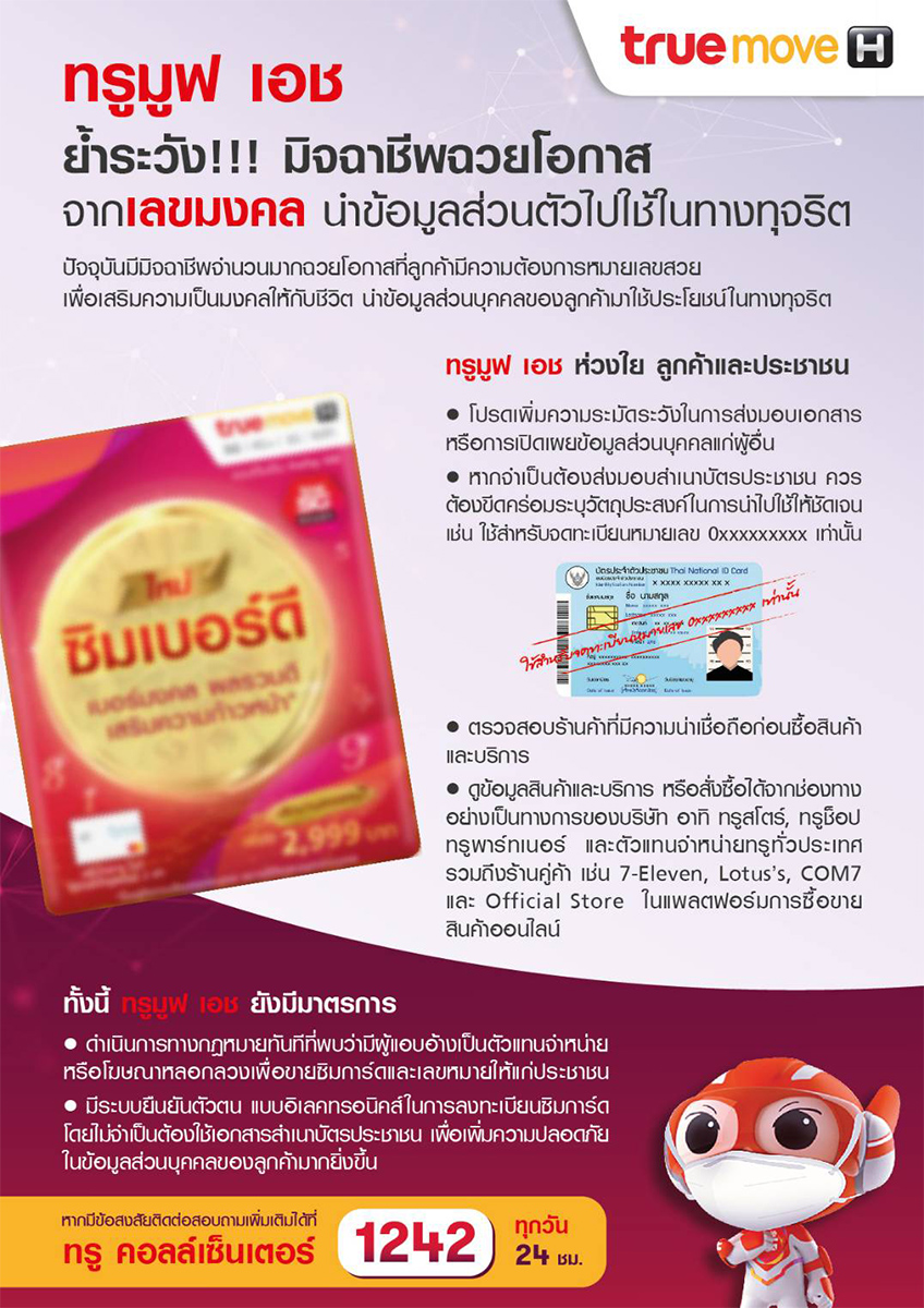 ทรูมูฟ เอช ห่วงใยลูกค้า และประชาชน จึงขอเตือน และโปรดเพิ่มความระมัดระวังในการส่งมอบเอกสารหรือการเปิดเผยข้อมูลส่วนบุคคลแก่ผู้อื่น หากมีความจำเป็นต้องส่งมอบสำเนาบัตรประชาชน ควรต้องขีดคร่อมระบุวัตถุประสงค์ในการนำไปใช้ให้ชัดเจน เช่น ใช้สำหรับจดทะเบียนหมายเลข 0xxxxxxxxx เท่านั้น เพื่อป้องกันการถูกมิจฉาชีพนำไปใช้ผิดวัตถุประสงค์ สร้างความเสียหายแก่ลูกค้าและประชาชนทั่วไป ทั้งนี้ บริษัท ทรู มูฟ เอช ยูนิเวอร์แซล คอมมิวนิเคชั่น จำกัด (“บริษัท”) มีนโยบายที่จะดำเนินการทางกฎหมายทันทีที่พบว่ามีผู้แอบอ้างเป็นตัวแทนจำหน่ายหรือโฆษณาหลอกลวงเพื่อขายซิมการ์ดและเลขหมายให้แก่ประชาชน และขอให้ประชาชนตรวจสอบร้านค้าที่มีความน่าเชื่อถือก่อนซื้อสินค้าและบริการ โดยสามารถดูข้อมูลสินค้าและบริการ หรือสั่งซื้อได้จากช่องทางอย่างเป็นทางการของบริษัท อาทิ ทรูสโตร์, ทรูช็อป, ทรูพาร์ทเนอร์ และตัวแทนจำหน่ายทรูทั่วประเทศ รวมถึงร้านคู่ค้า เช่น