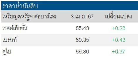 + ราคาน้ำมันดิบเวสต์เท็กซัสและเบรนท์ปรับตัวเพิ่มขึ้น หลังสถานการณ์ในตะวันออกกลางตึงเครียดที่สุดนับแต่ช่วงต้นปี 2567 ภายหลังอิหร่านเตรียมมาตรการตอบโต้ต่อเหตุการณ์โจมตีสถานกงสุลในซีเรีย ส่งผลให้การเผชิญหน้ากันโดยตรงระหว่างอิสราเอลและอิหร่าน ซึ่งถือเป็นชาติมหาอำนาจทางการทหารในภูมิภาคดังกล่าวมีแนวโน้มเพิ่มสูงขึ้น