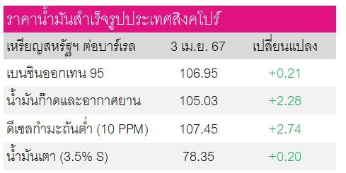 ราคาน้ำมันดีเซล : ราคาน้ำมันดีเซลปรับเพิ่มขึ้นมากกว่าราคาน้ำมันดิบดูไบ หลังตลาดกังวลต่ออุปทานน้ำมันดิบตึงตัวภายหลังโรงกลั่นในไต้หวันหยุดกำลังการผลิตชั่วคราวจากเหตุการณ์แผ่นดินไหวขนาด 7.2 ริกเตอร์ ซึ่งถือเป็นระดับที่รุนแรงที่สุดในรอบ 25 ปี นอกจากนี้ตลาดยังคงได้รับแรงหนุนจากการส่งออกน้ำมันดีเซลของรัสเซียที่ปรับลดลงเช่นกัน