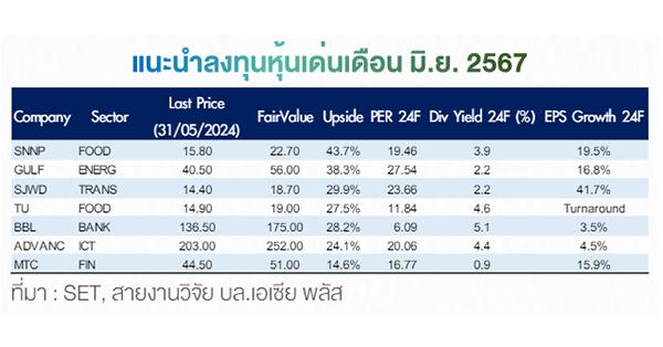 ประมาณปี 2567 สร้างเม็ดเงินเข้าสู่ระบบเศรษฐกิจ และมาตรการสร้างความเชื่อมั่นของตลาด ที่ทยอยเป็นรูปธรรมมากขึ้นในช่วงท้ายไตรมาส 2 เป็นต้น ส่วนประเด็นการกลับมาของ LTF หากเกิดขึ้นจริง ฝ่ายวิจัยฯ คาดว่าจะกลับมาช่วยเสริมสภาพคล่อง และช่วยผลักดันให้ SET Index ทยอยฟื้นตัวในช่วงที่เหลือของปี ฝ่ายวิจัยให้น้ำหนักหุ้นไทยที่คำแนะนำ Slightly Overweight และ วางกรอบการเคลื่อนไหวของ SET Index เดือน มิ.ย.67 ไว้ที่ 1,340 – 1,400 จุดส่วนกลยุทธ์ยังคงเน้นทยอยสะสมหุ้นแนวโน้ม กำไรโตต่อในช่วงฤดูกาล TU, SNNP, SJWD และหุ้นที่เป็น เป้าหมายของ Fund flow ในระยะถัดไป คือ GULF, BBL, ADVANC, MTC หมุนเวียนเข้ามาในพอร์ตตามจังหวะที่เหมาะสม