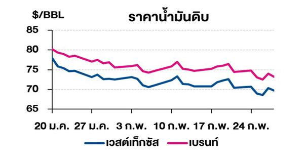 (-) ราคาน้ำมันดิบเวสต์เท็กซัสและเบรนท์ปรับลดราว 1% หลังไร้ความคืบหน้าจากการประชุมเจรจาระหว่างสหรัฐฯ และยูเครน เนื่องจากประธานาธิปดีสหรัฐฯ นายโดนัลด์ ทรัมป์ ต้องการให้สงครามระหว่างรัสเซียและยูเครนที่มีมาตลอดในช่วง 3 ปีที่ผ่านมา จบโดยไวที่สุด ทำให้ประธานาธิปดียูเครนนายโวโลดิเมียร์ เซเลนสกีไม่พอใจ และออกจากการประชุมในทำเนียบขาวสหรัฐฯ ซึ่งนโยบายสนับสนุนยูเครนเปลี่ยนไปจากยุคสมัยของนายโจ ไบเดน ที่มีการสนับสนุนยูเครนทางอาวุธ