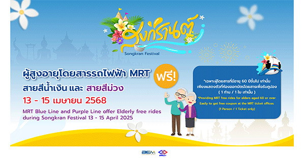 พร้อมกันนี้ ขอเชิญชวนผู้โดยสารที่มีอายุ 60 ปีขึ้นไป เดินทางด้วยรถไฟฟ้า MRT สายสีน้ำเงิน และสายสีม่วง ฟรี ตั้งแต่วันที่ 13 – 15 เมษายน 2568 ตลอดระยะเวลาให้บริการ เพื่อส่งเสริม สถาบันครอบครัวให้บุตรหลานพาผู้สูงอายุเดินทางท่องเที่ยวสถานที่รายรอบเส้นทางรถไฟฟ้า MRT เพียงแสดงบัตรประจำตัวประชาชนเพื่อขอรับคูปองได้ที่ห้องออกบัตรโดยสารทุกสถานี