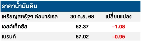 (+) สถาบันปิโตรเลียมด้านพลังงานสหรัฐฯ (API) รายงานปริมาณ น้ำมันดิบคงคลังสหรัฐฯ ประจำสัปดาห์สิ้นสุดวันที่ 26 ก.ย. 68 ปรับ ลดลง 3.67 ล้านบาร์เรล
