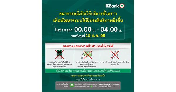 มิติหุ้น – ธนาคารกสิกรไทย แจ้งปิดให้บริการชั่วคราว เป็นเวลา 4 ชั่วโมง เพื่อพัฒนาระบบให้มีประสิทธิภาพยิ่งขึ้น ในวันพุธที่ 15 ตุลาคม 2568 เวลา 00.00-04.00 น. โดยช่องทางและบริการที่ไม่สามารถใช้งานได้ ดังนี้