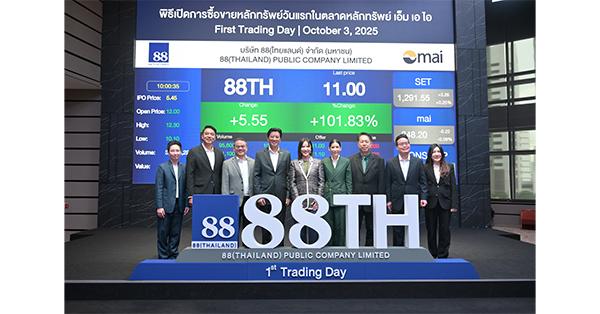 มิติหุ้น – อัสสเดช คงสิริ กรรมการและผู้จัดการ ตลาดหลักทรัพย์แห่งประเทศไทย ประพันธ์ เจริญประวัติ ผู้จัดการตลาดหลักทรัพย์ เอ็ม เอ ไอ พร้อมด้วย ณัฐฐินี ชวนะนิกุล ประธานเจ้าหน้าที่บริหาร และ นพรัตน์ มาลัยวงค์ ผู้ก่อตั้งและกรรมการ บมจ. 88(ไทยแลนด์) ร่วมพิธีเปิดการซื้อขายวันแรกในตลาดหลักทรัพย์ เอ็ม เอ ไอ ของ บมจ. 88(ไทยแลนด์) ผู้ผลิตและจำหน่ายผลิตภัณฑ์ดูแลเส้นผมและหนังศีรษะ “ไลโอ” ผลิตภัณฑ์ดูแลผิว “โฮน” และ เครื่องสำอาง “เวอร์.88” ในวันที่ 3 ตุลาคม 2568 มูลค่าหลักทรัพย์ ณ ราคา IPO 1,158.125 ล้านบาท โดยใช้ชื่อย่อในการซื้อขายหลักทรัพย์ว่า “88TH”