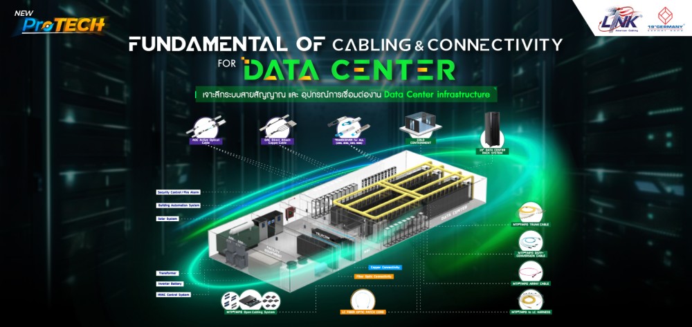 - Cabling & Connectivity อธิบายมาตรฐานสากล TIA-942, TIA-568, TIA-606 ที่กำหนดหลักการเดินสายสัญญาณ พร้อมแนะนำสินค้า และอุปกรณ์ CAT 6A, CAT 8 และสายใยแก้วนำแสงชนิด MPO รวมถึง LINK Rack และ GERMAN RACK ที่ออกแบบตามมาตรฐาน ANSI/EIA-310 เพื่อความแข็งแรง ทนทาน และรองรับการขยายตัวในอนาคต