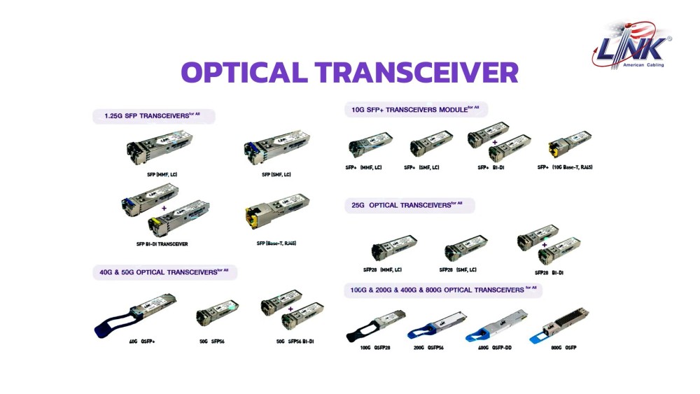 - Active Device & Transceiver แนวทางการเลือกใช้อุปกรณ์เชื่อมต่อสัญญาณความเร็วสูงของ Data Center ทุกรูปแบบ ทั้ง DAC, AOC หรือ Optical Transceiver รวมถึงบทบาทของเทคโนโลยีอินเตอร์เน็ตมาตรฐาน และเทคโนโลยีเครือข่ายความเร็วสูง (InfiniBand) ในการรองรับ AI เพื่อการประมวลผลประสิทธิภาพสูง (High Performance Computing) สำหรับผลิตภัณฑ์ Optical Transceiver ของ LINK เป็นทางเลือกอย่างครบวงจรด้วยการใช้เทคโนโลยีขั้นสูงที่รองรับการเชื่อมต่อที่หลากหลายออกแบบมาเพื่อการใช้งานร่วมกับแบรนด์อื่น ๆ ได้ มีศูนย์พัฒนาเพื่อไว้คอยรองรับให้เข้าถึงการใช้งานได้อย่างรวดเร็ว สามารถรับ – ส่งสัญญาณได้ด้วยระยะที่ไกลขึ้น และยังเป็นส่วนสำคัญในการเชื่อมต่ออุปกรณ์ NETWORKING ให้สามารถรองรับการทำงานได้อย่างเต็มประสิทธิภาพ ส่งผ่านการแลกเปลี่ยนข้อมูลที่มากมายมหาศาลได้อย่างไร้ขีดจำกัด โดยมี จุดแข็งที่มากกว่ากับ LINK TRANCIEVER CLINIC FOR ALL ที่จะมาปลดล็อกทุกปัญหาของการเชื่อมต่อด้วยคุณสมบัติเด่น ดังนี้