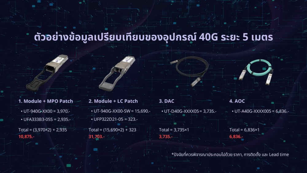 - 3 DAY DELIVERY : สามารถส่งสินค้า SFP ได้ภายใน 3 วันทำการ และสินค้า DAC, AOC ภายใน 3 Week โดยหากต้องการนำสินค้าไปทดสอบ ก็สามารถติดต่อ ขอรับไปทดสอบได้ครั้งละ 1 สัปดาห์ แต่ไม่เกิน 3 สัปดาห์ ต่อเนื่อง