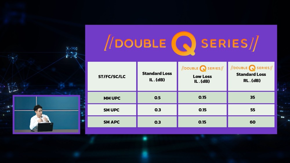 นอกจากนี้ ยังได้เปิดประเด็น “เทรนด์อนาคต” ของเทคโนโลยีการเชื่อมต่อที่มีประสิทธิภาพเหนือกว่ามาตรฐาน จากกลุ่ม Fiber Optic Cable ในตระกูล Double Q Series และสาย Patch cord ที่คุณภาพสูงและติดตั้งง่าย และยังสามารถส่งข้อมูลได้เร็วและมีความแม่นยำกว่าเดิม