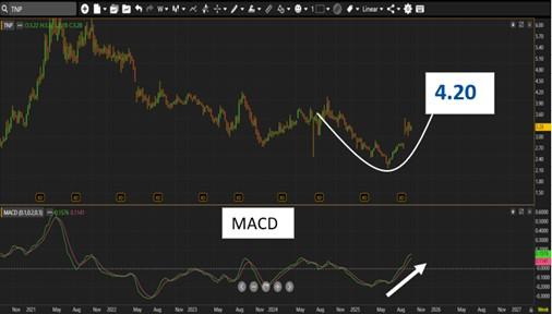กราฟ TNP ฟอร์มตัวในกราฟแท่งเทียนเป็น U-shape  โดยเครื่องมือ MACD ดีดตัวขึ้นเหนือแนวเส้นศูนย์ หมายถึงการกลับเข้าสู่ขาขึ้นในระยะกลาง ซึ่งจ่ะทำให้กราฟเดินหน้าต่อเนื่อง และมีแนวต้านสูงถึง 4.20 บาท
