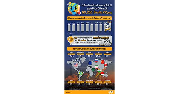 - ประเทศไทยปล่อยก๊าซเรือนกระจกสูงสุดเป็นอันดับ 21 ของโลก (อันดับ 3 ในอาเซียน) ด้วยปริมาณ 422 ล้านตัน CO2eq เพิ่มขึ้น 12 ล้านตัน CO2eq หรือเพิ่มขึ้น 2.9% จากปี 2566 โดยก๊าซเรือนกระจกส่วนใหญ่ (67.2%) เป็นก๊าซคาร์บอนไดออกไซต์ แหล่งปล่อยก๊าซฯ หลัก คือ อุตสาหกรรมพลังงาน