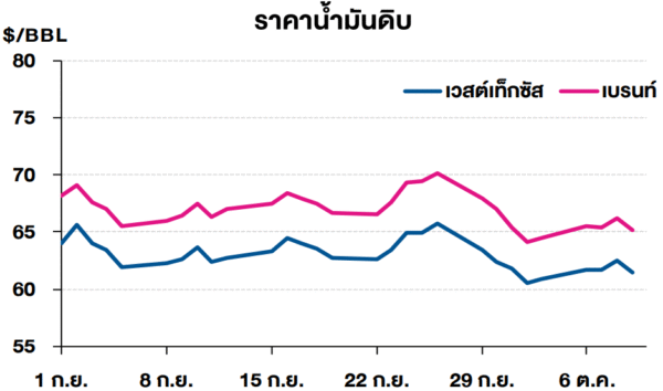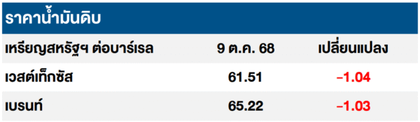 (-/+) อย่างไรก็ตาม ตลาดได้คลายกังวลภาวะอุปทานน้ำมันดิบโลก ล้นตลาด หลังเมื่อวันอาทิตย์ที่ผ่านมากลุ่ม OPEC+ ได้มีมติปรับเพิ่มกำลังการผลิตน้ำมันดิบเดือน พ.ย. 68 ที่ระดับ 0.134 ล้านบาร์เรล ซึ่งเป็นระดับที่ต่ำกว่านักวิเคราะห์คาดการณ์ก่อนหน้าว่าทางกลุ่มจะเพิ่มกำลังการผลิตน้ำมันดิบอยู่ที่ระดับ 0.5 ล้านบาร์เรลต่อวัน