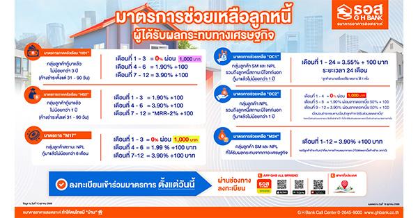 - มาตรการช่วยเหลือ “M24” สำหรับกลุ่มลูกค้า SM และ NPL ลูกค้ารายย่อย ลูกค้าสวัสดิการ ลูกค้าประเภทแฟลต หรือ ลูกค้าที่ได้รับผลกระทบจากภาวะเศรษฐกิจชะลอตัวและผลกระทบจากสภาวะเศรษฐกิจไทยระยะเวลาให้ความช่วยเหลือ 1 ปี ผ่อนชำระเงินงวดเดือนที่ 1 – 12 คำนวณจากอัตราดอกเบี้ย 3.90% +100 บาท