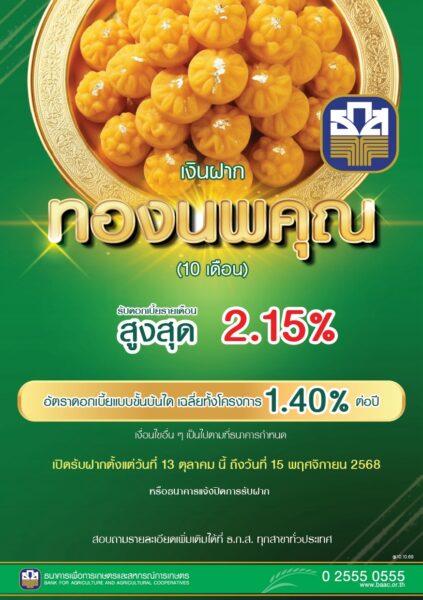 นายไพศาล หงษ์ทอง รองผู้จัดการธนาคารเพื่อการเกษตรและสหกรณ์การเกษตร (ธ.ก.ส.) เปิดเผยว่า ธ.ก.ส. เปิดตัวเงินฝากทองนพคุณ เพื่อส่งเสริมพฤติกรรมการออมให้กับประชาชนอย่างต่อเนื่อง เมื่อฝากเงินแล้วรับดอกเบี้ยแบบขั้นบันไดสูงสุดร้อยละ 2.15 ต่อปี ระยะเวลาฝาก 10 เดือน แบ่งอัตราดอกเบี้ยเป็น 3 ช่วง ประกอบด้วยช่วงที่ 1 ตั้งแต่ 13 ตุลาคม 2568 ถึง 15 เมษายน 2569 อัตราดอกเบี้ยร้อยละ 1.30 ต่อปี ช่วงที่ 2 ตั้งแต่วันที่ 16 เมษายน 2569 – 15 กรกฎาคม 2569 อัตราดอกเบี้ยร้อยละ 1.35 ต่อปี และช่วงที่ 3 ตั้งแต่วันที่ 16 กรกฎาคม 2569 – 13 สิงหาคม 2569 รับดอกเบี้ยสูงสุดถึงร้อยละ 2.15 ต่อปี เฉลี่ยทั้งโครงการ ร้อยละ 1.40 ต่อปี (เทียบเท่าอัตราดอกเบี้ยเงินฝากประจำ ร้อยละ 1.65 ต่อปี) ฝากขั้นต่ำครั้งละ 10,000 บาท วงเงินฝากรวมสูงสุดไม่เกิน 100 ล้านบาทต่อราย สำหรับบุคคลธรรมดาไม่เสียภาษีดอกเบี้ยเงินฝากอีกด้วย