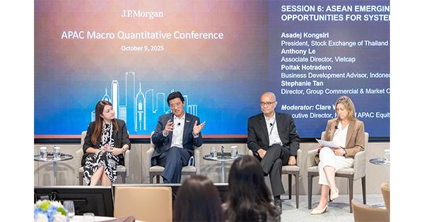 มิติหุ้น – อัสสเดช คงสิริ กรรมการและผู้จัดการ ตลาดหลักทรัพย์แห่งประเทศไทย ร่วมเสวนาในหัวข้อ “ASEAN Emerging Market Liquidity and Considerations for Systematic Trading” พร้อมด้วยผู้บริหารระดับสูงจากตลาดหลักทรัพย์ในภูมิภาคอาเซียน ภายในงาน APAC Macro Quantitative Conference ที่จัดโดย J.P. Morgan เพื่อแลกเปลี่ยนมุมมองเกี่ยวกับแนวโน้มสภาพคล่องในตลาดเกิดใหม่ การพัฒนาโครงสร้างตลาดและเทคโนโลยี รวมถึงบทบาทของตลาดหลักทรัพย์ในการเสริมสร้างความเชื่อมั่นและความยั่งยืนของตลาดทุนอาเซียน โดยมีผู้จัดการกองทุนเข้าร่วมงานมากกว่า 100 ราย ณ เขตบริหารพิเศษฮ่องกง เมื่อวันที่ 9 ตุลาคม 2568