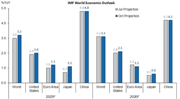 - กองทุนการเงินระหว่างประเทศ (IMF) เปิดเผยประมาณการเศรษฐกิจชุดใหม่ในรายงานแนวโน้มเศรษฐกิจโลก (WEO) โดย IMF ปรับเพิ่มประมาณการเศรษฐกิจโลก ปี 2025F เป็น 3.2% YoY เพิ่มขึ้นจากประมาณการครั้งก่อนในเดือน ก.ค. 2025 ที่ 3.0% ขณะที่ IMF คงคาดการณ์การเติบโตของปี 2026F ไว้ที่ 3.1% อย่างไรก็ดี เศรษฐกิจโลกยังมีแนวโน้มขยายตัวต่ำกว่าค่าเฉลี่ยในอดีตที่ 3.7% ต่อปี (ค่าเฉลี่ยตั้งแต่ปี 2000-2019) นอกจากนี้ IMF ระบุเพิ่มว่าความเสี่ยงต่อประมาณการยังคงโน้มไปทางด้านต่ำ (“Still Tilted to the Downside”)