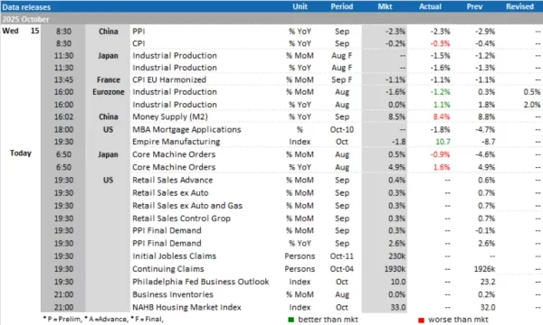 - สหรัฐฯ: ยอดค้าปลีก (Retail Sales), ดัชนีราคาผู้ผลิต (PPI) เดือน ก.ย., ยอดขอรับสวัสดิการว่างงานครั้งแรก (Initial Jobless Claims) สิ้นสุดสัปดาห์ ณ วันที่ 11 ต.ค. และดัชนีการเคหะ (NAHB Housing Market Index) เดือน ต.ค.