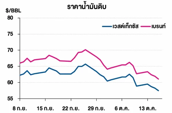 (-) สำนักงานสารสนเทศด้านพลังงานของสหรัฐฯ (EIA) เผยตัวเลขน้ำมันดิบคงคลังสหรัฐฯ ประจำสัปดาห์สิ้นสุด ณ วันที่ 10 ต.ค. 68 ปรับเพิ่มขึ้น 3.5 ล้านบาร์เรล สู่ระดับ 423.8 ล้านบาร์เรล สวนทางกับที่นักวิเคราะห์คาดการณ์ว่าจะลดลง 1.2 ล้านบาร์เรล