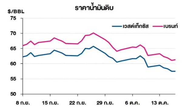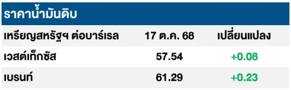 (+) ราคาน้ำมันดิบเวสต์เท็กซัสและเบรนท์ปรับเพิ่มขึ้นเล็กน้อย หลังจากที่ประธานาธิบดีสหรัฐฯ นายโดนัลด์ ทรัมป์ แสดงความเชื่อมั่นว่าการเจรจาการค้าระหว่างสหรัฐฯ และจีนในสัปดาห์หน้ามีแนวโน้มผ่อนคลายมากขึ้นซึ่งอาจช่วยคลี่คลายความตึงเครียดจากสงครามการค้าโดยรัฐมนตรีว่าการกระทรวงการคลังของสหรัฐฯ และรองนายกรัฐมนตรีของจีนมีกำหนดพบปะกันที่ประเทศมาเลเซีย เพื่อหารือมาตรการผ่อนคลายใหม่ระหว่างสองประเทศ และเตรียมความพร้อมสำหรับการประชุมระหว่างผู้นำทั้งสอง ณ ประเทศเกาหลีใต้ ในช่วงปลายเดือน ต.ค. 68 ซึ่งจะจัดขึ้นนอกรอบการประชุมสุดยอดผู้นำความร่วมมือทางเศรษฐกิจเอเชียแปซิฟิก