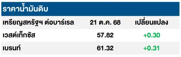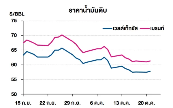 (+)  ราคาน้ำมันดิบเวสต์เท็กซัสและเบรนท์ปรับเพิ่มขึ้น หลังน้ำมันดิบและน้ำมันเบนซินคงคลังสหรัฐฯ อยู่ในระดับค่อนข้างต่ำ โดยสถาบันปิโตรเลียมของอเมริกา (API)ได้เผยตัวเลขน้ำมันดิบคงคลังที่ปรับลดลง 2.98 ล้านบาร์เรล รวมถึงน้ำมันเบนซินคงคลังที่ลดลง 236,00 บาร์เรล  ณ สัปดาห์สิ้นสุดวันที่ 17 ต.ค. นอกจากนี้สหรัฐยังมีแผนการซื้อน้ำมันดิบ 1 ล้านบาร์เรลเพื่อการสำรองทางยุทธศาสตร์