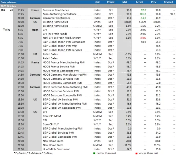 - ญี่ปุ่น, ยูโรโซน, อังกฤษ และสหรัฐฯ: ดัชนีผู้จัดการฝ่ายจัดซื้อภาคการผลิตและภาคบริการ (Manufacturing and Services PMI) เบื้องต้น เดือน ต.ค.