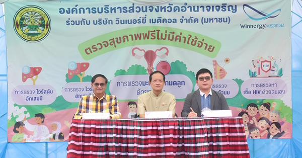 มิติหุ้น – นายณฐวัฒน์ อธิรัฐธนาธรณ์ (ขวา) ตัวแทนจาก บริษัท วินเนอร์ยี่ เมดิคอล จำกัด (มหาชน) หรือ WINMED ร่วมลงนามบันทึกข้อตกลงความร่วมมือ (MOU) กับ นายพนัส พันธุ์วรรณ (ซ้าย) นายกองค์การบริหารส่วนจังหวัดอำนาจเจริญ เพื่อดำเนินโครงการตรวจคัดกรองมะเร็งปากมดลูกในกลุ่มสตรีอายุ 30–60 ปี โดยมีนายอนุรัตน์ ธรรมประจำจิต (กลาง) ผู้ว่าราชการจังหวัดอำนาจเจริญ เป็นประธานในพิธีและร่วมเป็นสักขีพยาน โครงการดังกล่าวมุ่งให้บริการด้านสุขภาพปฐมภูมิแก่ประชาชนในพื้นที่ ผ่านการใช้ชุดเก็บตัวอย่างด้วยตนเอง (HPV Self Sampling) เพื่อเพิ่มการเข้าถึงการตรวจคัดกรองอย่างสะดวกและปลอดภัย โดยมีผู้เข้าร่วมจากหน่วยงานราชการ อาสาสมัครสาธารณสุข ประชาชนในตำบลปลาค้าวและตำบลข้างเคียง รวมถึงเจ้าหน้าที่จากสถานีอนามัยเฉลิมพระเกียรติ 60 พรรษา นวมินทราชินีปลาค้าว และโรงพยาบาลส่งเสริมสุขภาพตำบลใกล้เคียง งานจัดขึ้น ณ องค์การบริหารส่วนจังหวัดอำนาจเจริญ เมื่อเร็ว ๆนี้