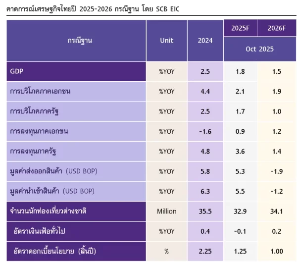 SCB EIC ยังคงประเมินว่า อัตราดอกเบี้ยนโยบายจะปรับลดลงมาอยู่ที่ 1.25% ในการประชุมเดือน ธ.ค. นี้ และปรับลดอีกครั้งในช่วงต้นปี 2569 ลงมาอยู่ที่ 1.0% แนวโน้มเศรษฐกิจไทยจะชะลอลงต่อเนื่องในช่วงครึ่งหลังของปีนี้จนถึงครึ่งแรกของปี 2569 เนื่องจากความเปราะบางของภาคธุรกิจและครัวเรือนจะกดดันอุปสงค์ในประเทศอย่างต่อเนื่อง ภาวะการเงินไทยยังตึงตัวสูง ไม่สอดคล้องกับอัตราการขยายตัวของเศรษฐกิจไทยที่ต่ำกว่าระดับศักยภาพอยู่มาก SCB EIC จึงประเมินว่า กนง. จะปรับลดอัตราดอกเบี้ยนโยบายอีกครั้งในการประชุมเดือน ธ.ค. นี้ และอีก 1 ครั้งในช่วงต้นปีหน้าไปที่ระดับ 1% นโยบายการเงินจะมีบทบาทช่วยลดความเปราะบางของเศรษฐกิจไทยในระยะข้างหน้า