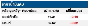 (+) ตลาดยังจับตามองถึงความสัมพันธ์ทางเศรษฐกิจระหว่างสหรัฐฯ และจีนในการประชุมของนายโดนัลด์ ทรัมป์ ประธานาธิบดีสหรัฐฯ และนายสีจิ้งผิง ประธานาธิบดีจีน ที่จะจัดขึ้นในวันที่ 30 ต.ค. 68 ที่เกาหลีใต้ หลังสงครามการค้าระหว่างสหรัฐฯ และจีนเริ่มคลายความตึงเครียดจากการบรรลุข้อตกลงในกรอบข้อตกลงเบื้องต้นจากการพบกันของ คณะเจ้าหน้าที่เศรษฐกิจของทั้งสองประเทศ ที่กัวลาลัมเปอร์ เมื่อสุดสัปดาห์ที่ผ่านมา ทั้งนี้ หากข้อตกลงดังกล่าวสามารถเห็นชอบจากผู้นำทั้งสองประเทศ จะช่วยลดความกังวลต่อภาษีศุลกากรและจะทำให้เศรษฐกิจกลับมาฟื้นตัวได้