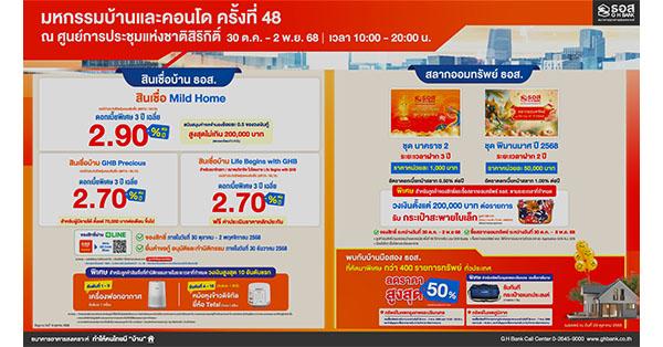(1) สินเชื่อบ้านอัตราดอกเบี้ยพิเศษ นำโดย สินเชื่อบ้าน GHB Precious ปี 2568 : อัตราดอกเบี้ยปีที่ 1 – 2 เริ่มต้น 2.70% ต่อปี ปีที่ 3 เท่ากับ MRR-3.545% ต่อปี อัตราดอกเบี้ยเฉลี่ย 3 ปีแรกเพียง 2.70% และปีที่ 4 จนถึงตลอดอายุสัญญา กรณีลูกค้าสวัสดิการ เท่ากับ MRR-1.00% ต่อปี ลูกค้ารายย่อย เท่ากับ MRR-0.50% ต่อปี และซื้ออุปกรณ์ฯ/ชำระหนี้ฯ เท่ากับ MRR (อัตราดอกเบี้ย MRR ของ ธอส. ปัจจุบันอยู่ที่ 6.245% ต่อปี) กรณีกู้ 1 ล้านบาท ผ่อนชำระเงินงวดเริ่มต้นเพียงเดือนละ 3,200 บาท สำหรับผู้ที่มีรายได้ตั้งแต่ 70,000 บาทต่อเดือนขึ้นไป หรือมีวงเงินนิติกรรมรวมทุกบัญชี ภายใต้หลักประกันเดียวกันตั้งแต่ 7 ล้านบาทขึ้นไปที่ต้องการกู้เพื่อซื้อ ปลูกสร้าง ต่อเติม ขยาย ซ่อมแซม ไถ่ถอนจำนองจากสถาบันการเงินอื่น ชำระหนี้พร้อมไถ่ถอนจำนอง และกู้เพิ่ม สินเชื่อบ้าน Life Begins with GHB ปี 2568 : อัตราดอกเบี้ยปีที่ 1 – 2 เริ่มต้น 2.70% ต่อปี ปีที่ 3 เท่ากับ MRR-3.545% ต่อปี อัตราดอกเบี้ยเฉลี่ย 3 ปีแรกเพียง 2.70% และปีที่ 4 จนถึงตลอดอายุสัญญา กรณีลูกค้าสวัสดิการ เท่ากับ MRR-1.00% ต่อปี ลูกค้ารายย่อย เท่ากับ MRR-0.50% ต่อปี และซื้ออุปกรณ์ฯ/ชำระหนี้ฯ เท่ากับ MRR สำหรับสมาชิกสภา / สมาคมวิชาชีพ ภายใต้โครงการ Life Begins with GHB ครอบคลุมการกู้ทุกวัตถุประสงค์ รวมถึงชำระหนี้พร้อมไถ่ถอนจำนอง กรณีกู้ 1 ล้านบาท ผ่อนชำระเงินงวดเริ่มต้นเพียงเดือนละ 3,200 บาท พิเศษ ! ฟรีค่าประเมินราคาหลักประกัน สินเชื่อ Mild Home ปี 2568 : อัตราดอกเบี้ยปีที่ 1 – 2 เริ่มต้น 2.90% ต่อปี ปีที่ 3 เท่ากับ MRR-3.345% ต่อปี อัตราดอกเบี้ยเฉลี่ย 3 ปีแรกเพียง 2.90% และปีที่ 4 จนถึงตลอดอายุสัญญา กรณีลูกค้าสวัสดิการ เท่ากับ MRR-1.00% ต่อปี ลูกค้ารายย่อย เท่ากับ MRR-0.50% ต่อปี และซื้ออุปกรณ์ ฯ / ชำระหนี้ ฯ เท่ากับ MRR ครอบคลุมการกู้ทุกวัตถุประสงค์ รวมถึงชำระหนี้พร้อมไถ่ถอนจำนอง พิเศษ ! ธนาคารสนับสนุนค่าจดจำนองร้อยละ 0.5 ของวงเงินกู้ สูงสุดไม่เกิน 2 แสนบาท (เฉพาะอัตราดอกเบี้ยแบบที่ 2) กรณีกู้ 1 ล้านบาท ผ่อนชำระเงินงวดเริ่มต้นเพียงเดือนละ 3,300 บาท ผู้ที่สนใจสามารถจองสิทธิ์ภายในงานผ่าน Line GHB Buddy ระหว่างวันที่ 30 ตุลาคม – 2 พฤศจิกายน 2568 ยื่นคำขอกู้ อนุมัติและทำนิติกรรมภายในวันที่ 30 ธันวาคม 2568