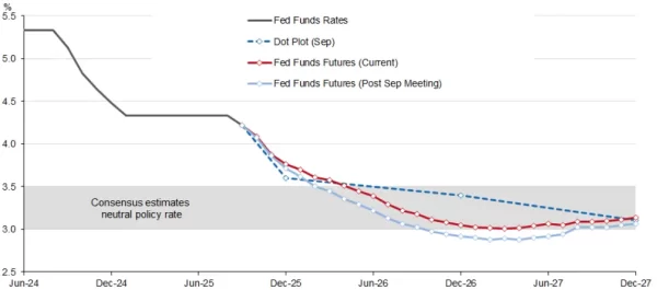 - โดยสรุป การสื่อสารของนาย Powell โน้มไปทางเข้มงวดกว่าที่คาดการณ์ไว้ ซึ่งกล่าวชัดเจนว่าการลดดอกเบี้ยในการประชุมครั้งถัดไปนั้นไม่ใช่สิ่งที่แน่นอน นอกจากนี้ ประธาน Fed ยังเปรียบเทียบการดำเนินนโยบายการเงินในช่วงที่ข้อมูลเศรษฐกิจหลายอย่างไม่มีการเปิดเผยเนื่องจากรัฐบาลหยุดทำการ (Government Shutdown) ว่าเปรียบเสมือนกับการขับรถลุยหมอก ทำให้จึงต้องชะลอความเร็วลงมา (“If you’re dringing in the fog, you slow down”) ทั้งนี้ นาย Powell ยังพยายามสงวนท่าทีที่เข้มงวดไว้ด้วยเช่นกัน โดยกล่าวว่านโยบายการเงินยังมีความตึงตัวอยู่บ้าง ซึ่งเรามองว่า ในกรณีที่รัฐบาลสามารถกลับมาเผยแพร่ข้อมูลได้ในเดือนหน้า ข้อมูลที่จะเปิดเผยจะมีแนวโน้มสะท้อนภาพที่อ่อนแอ หลังข้าราชการ 6.5 แสนรายถูกพักงาน ซึ่งอาจส่งผลด้านสูงต่ออัตราการว่างงานในเดือน ต.ค. และบดบังภูมิทัศน์ทางเศรษฐกิจที่แท้จริง ขณะเดียวกัน เครื่องชี้เศรษฐกิจที่รายงานออกมาในปัจจุบันยังสะท้อนภาพการชะลอตัวลงของตลาดแรงงาน อาทิ การจ้างงานภาคเอกชน (ADP Employment) ที่ทรงตัวในระดับต่ำ ขณะที่ตำแหน่งงานว่างเปิดใหม่ปรับตัวลดลงต่อเนื่อง รวมทั้งรัฐบาลกลางที่ดำเนินมาตรการหยุดการจ้างานใหม่