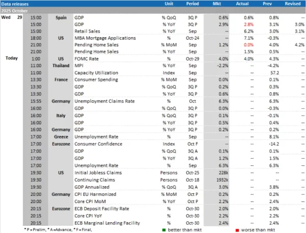 - สหรัฐฯ: ผลการประชุมธนาคารกลางสหรัฐฯ (FOMC), ยอดขอรับสวัสดิการว่างงานครั้งแรก (Initial Jobless Claims) สิ้นสุดสัปดาห์ ณ วันที่ 25 ต.ค. และ GDP Annualized Q3/2025