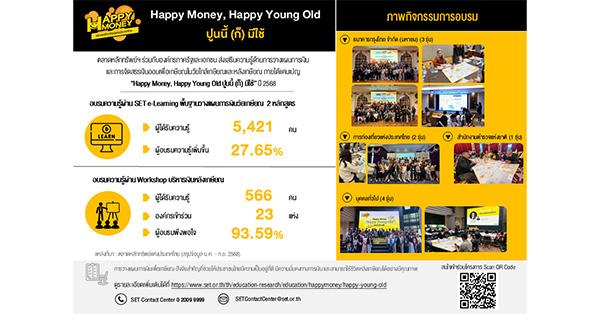 โครงการ “Happy Money, Happy Young Old ปูนนี้ (ก็) มีใช้” จัดขึ้นอย่างต่อเนื่องตั้งแต่ปี 2566 เพื่อสร้างความพร้อมทางการเงินรับมือวัยเกษียณ ผู้สนใจสามารถเรียนรู้ฟรีผ่าน SET e-Learning 2 หลักสูตร ได้แก่ หลักสูตร “วัย 50+: เตรียมชีวิตมั่งคั่ง รับวันเกษียณ” และหลักสูตร “วัย 60+: บริหารเงินหลังเกษียณสไตล์วัยเก๋า” หรือดูรายละเอียดได้ที่ https://www.set.or.th/th/education-research/education/happymoney/happy-young-old สอบถาม SET Contact Center 0 2009 9999