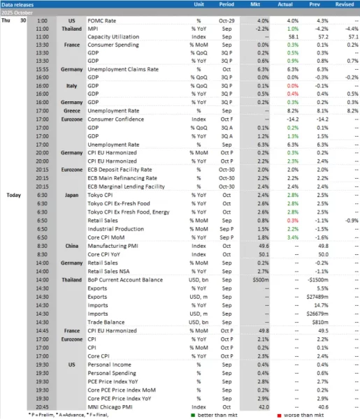• สหรัฐฯ: ดัชนีรายจ่ายเพื่อการบริโภคส่วนบุคคล (PCE), รายได้ส่วนบุคคล (Personal Income), การใช้จ่ายส่วนบุคคล (Personal Spending) เดือน ก.ย. และดัชนีผู้จัดการฝ่ายจัดซื้อรัฐชิคาโก (MNI Chicago PMI) เดือน ต.ค.
