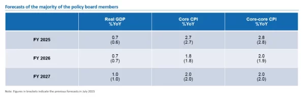 ด้านแนวโน้มเศรษฐกิจ (Economic Outlook): BoJ ปรับเพิ่มประมาณการเศรษฐกิจ (Real GDP growth) ในปีงบประมาณ 2025 (FY2025) ขึ้นเล็กน้อยจาก 0.6% เป็น 0.7% ขณะที่คงประมาณการการเติบโตของ Real GDP growth ในปีงบประมาณ 2026 และ 2027 ไว้ที่ 0.7% และ 1.0% ตามลำดับ