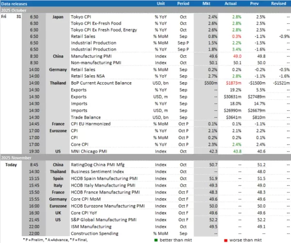 • จีน, ยูโรโซน, อังกฤษ และสหรัฐฯ: ดัชนีดัชนีผู้จัดการฝ่ายจัดซื้อภาคการผลิต (Manufacturing PMI) เดือน ต.ค.