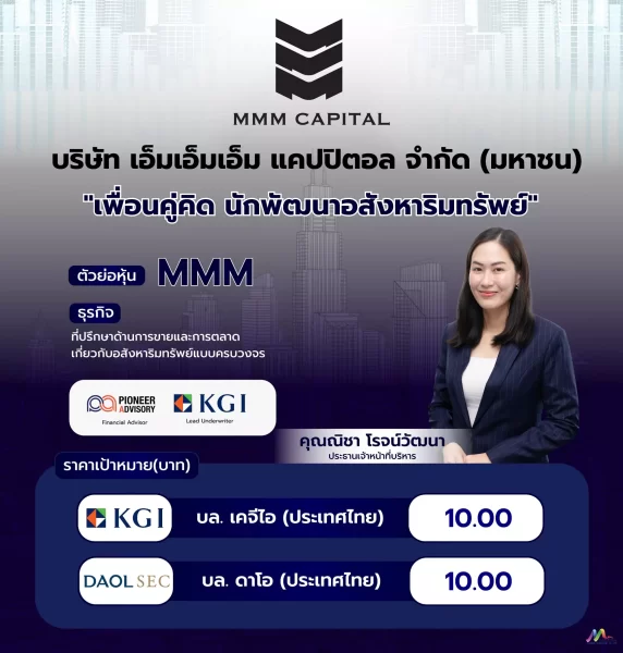 มิติหุ้น – บมจ.เอ็มเอ็มเอ็ม แคปปิตอล “MMM” ประกาศตอกย้ำ Business Model ในการเป็น “โบรกเกอร์อสังหาริมทรัพย์” แบบครบวงจร ภายใต้จุดเด่นในการวางตำแหน่งของบริษัทฯ เป็น “มินิมาร์ทอสังหาริมทรัพย์” พร้อมนำร่องรายแรกจากตลาด LiVEx สู ตลาดหลักทรัพย์ mai เล็ง ระดมทุนขยายพอร์ตธุรกิจ 3 BU เร่งต่อยอดการเติบโตในอนาคต ด้าน บล.เคจีไอ -บล.ดาโอ สแกนหุ้น น้องใหม่ “MMM” เคาะราคาเป้าหมาย 10.00 บาท/หุ้น