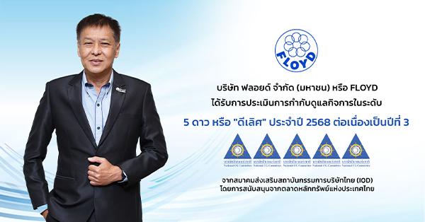 FLOYD ได้รับการประเมิน CGR ในเกณฑ์ “ดีเลิศ” ระดับ 5 ดาว ประจำปี 2568 ต่อเนื่องเป็นปีที่ 3 สะท้อนความมุ่งมั่นองค์กรดำเนินธุรกิจตามหลักธรรมาภิบาลที่ดี