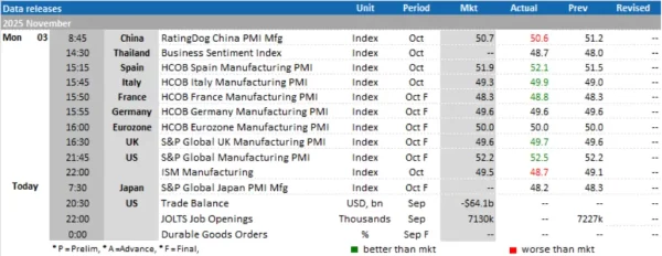 - ญี่ปุ่น: ดัชนีดัชนีผู้จัดการฝ่ายจัดซื้อภาคการผลิต (Manufacturing PMI) เดือน ต.ค.