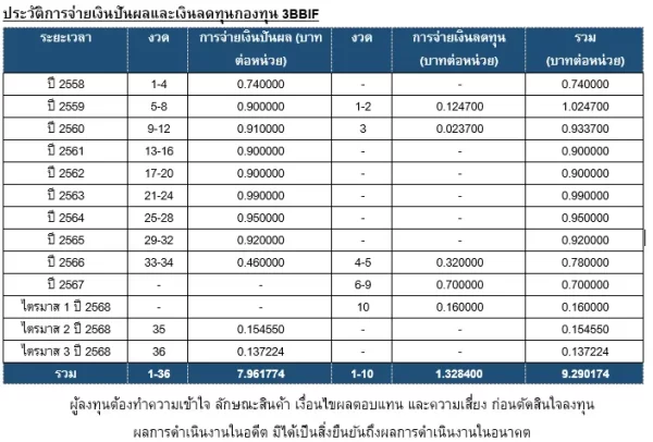 มิติหุ้น – นายพรชลิต พลอยกระจ่าง กรรมการผู้จัดการ Head of Real Estate Infrastructure Investment บริษัทหลักทรัพย์จัดการกองทุนรวม บัวหลวง จำกัด หรือ BBLAM เปิดเผยว่า กองทุนรวมโครงสร้างพื้นฐาน บรอดแบนด์อินเทอร์เน็ต สามบีบี หรือ 3BBIF เตรียมจ่ายเงินปันผลต่อเนื่องครั้งที่ 36 ในอัตราหน่วยลงทุนละ 0.137224 บาท คิดเป็นเงินทั้งสิ้น 1,097.79 ล้านบาท โดยจะปิดสมุดทะเบียนพักการโอนหน่วยลงทุนในวันที่ 18 พฤศจิกายน 2568 เพื่อกำหนดสิทธิในการรับเงินปันผล ซึ่งมีกำหนดจ่ายเงินในวันที่ 22 ธันวาคม 2568 เมื่อนับรวมตั้งแต่จัดตั้งกองทุน 3BBIF จนถึงการประกาศจ่ายเงินปันผลครั้งที่ 36 นี้ กองทุนจ่ายเงินปันผลรวมทั้งสิ้น 7.961774 บาทต่อหน่วยลงทุน ขณะเดียวกันมีการจ่ายเงินลดทุนไปแล้วทั้งหมด 10 ครั้ง รวมเป็นเงิน 1.328400 บาทต่อหน่วยลงทุน รวมจ่ายเงินปันผลและเงินลดทุนทั้งสิ้นเป็นเงิน 9.290174 บาท