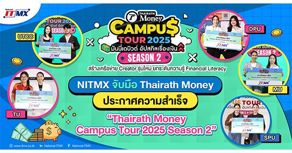 มิติหุ้น – ปิดฉากไปพร้อมความสำเร็จ! กับความร่วมมือระหว่าง บริษัท เนชั่นแนล ไอทีเอ็มเอ๊กซ์ จำกัด (NITMX) และ Thairath Money ในโครงการ “Thairath Money Campus Tour 2025 Season 2” ที่ตลอดเดือนตุลาคมได้เดินสายบุก 5 มหาวิทยาลัยทั่วประเทศ เพื่อสร้างแรงบันดาลใจให้คนรุ่นใหม่ก้าวสู่การเป็น “Creator สายการเงิน” ที่สามารถถ่ายทอดความรู้ด้านการเงิน การลงทุน และเทคโนโลยีทางการเงินได้อย่างสร้างสรรค์ เข้าใจง่าย และเข้าถึงคนทุกกลุ่ม ผ่านเวที “Thairath Money Creator Audition” ซึ่งเปิดโอกาสให้นักศึกษาผลิตคอนเทนต์สั้นตามโจทย์จาก NITMX ที่ครอบคลุมทั้งเรื่อง Personal Finance, Investment, Economics, Business Marketing และ Tech Innovation