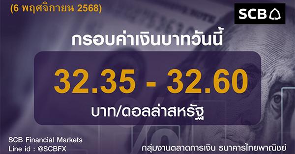 • กลุ่มงานตลาดการเงิน ธนาคารไทยพาณิชย์ ประเมินค่าเงินบาทวันนี้เคลื่อนไหวในกรอบ 32.35-32.60 บาท/ดอลลาร์