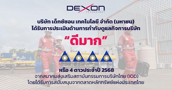 มิติหุ้น – บริษัท เด็กซ์ซอน เทคโนโลยี จำกัด (มหาชน) หรือ DEXON ผู้ให้บริการตรวจสอบทางวิศวกรรมและสร้างนวัตกรรมทางเทคโนโลยี สำหรับตรวจสอบโครงสร้างและอุปกรณ์การผลิตในอุตสาหกรรม ได้รับการประเมินผลการกำกับดูแลกิจการในระดับ 4 ดาว หรือ “ดีมาก” จากโครงการสำรวจการกำกับดูแลกิจการของบริษัทจดทะเบียนไทย ประจำปี 2568 (Corporate Governance Report of Thai Listed Companies: CGR 2025) ซึ่งจัดโดยสมาคมส่งเสริมสถาบันกรรมการบริษัทไทย (IOD) โดยได้รับการสนับสนุนจากตลาดหลักทรัพย์แห่งประเทศไทย (SET) และสำนักงานคณะกรรมการกำกับหลักทรัพย์และตลาดหลักทรัพย์ (ก.ล.ต.)