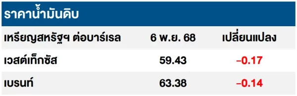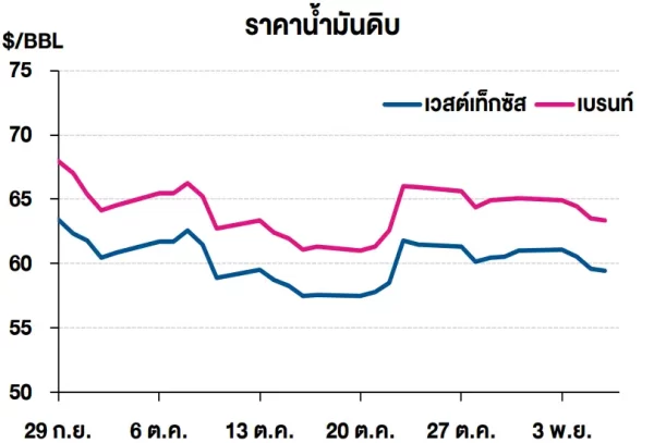 (-) ราคาน้ำมันดิบเวสต์เท็กซัสและเบรนท์ปรับลดลง หลังการผลิตน้ำมันดิบของกลุ่มโอเปกในเดือน ต.ค. 68 ปรับเพิ่มขึ้น 0.05 ล้านบาร์เรลต่อวัน เมื่อเทียบกับเดือนก่อนหน้ามาอยู่ที่ระดับ 29.1 ล้านบาร์เรลต่อวัน โดยการผลิตน้ำมันดิบของซาอุดิอาระเบียปรับเพิ่ม 0.04 ล้านบาร์เรลต่อวัน เมื่อเทียบกับเดือนก่อนหน้ามาอยู่ที่ระดับ 10 ล้านบาร์เรลต่อวัน ในขณะที่ซาอุดิอาระเบียประกาศปรับลดส่วนต่างราคาน้ำมันดิบ Arab Light กับค่าเฉลี่ยราคาน้ำมันดิบดูไบและโอมานในเดือน ธ.ค. 68 มาอยู่ที่ระดับ 1 เหรียญสหรัฐฯ ต่อบาร์เรล ซึ่งถือเป็นระดับที่ต่ำที่สุดในรอบ 11 เดือน