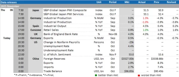 - สหรัฐฯ: การจ้างงานนอกภาคการเกษตร (Change in Nonfarm Payrolls), อัตราการว่างงาน (Unemployment Rate) เดือน ต.ค. และะดัชนีความเชื่อมั่นผู้บริโภคของมหาวิทยาลัยมิชิแกน (U. of Mich. Sentiment) เบื้องต้น เดือน พ.ย.
