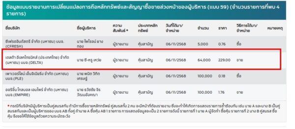 มิติหุ้น – ผู้สื่อข่าวรายงานว่า ผู้บริหาร DELTA นายซี-หรู เหว่ย ผู้อำนวยการฝ่ายผลิต รายงานการขาย DELTA รวม 64,000 หุ้น ที่ราคา 229 บาทต่อหุ้น มูลค่า 14,656,000 บาท (6 พ.ย. 68)