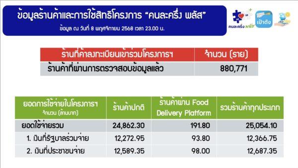 – ขณะที่กระทรวงการคลังอัพเดตข้อมูล โครงการ “คนละครึ่ง พลัส” ล่าสุด จนถึงเวลา 23.00 น. วันที่ 8 พ.ย. 68 มียอดการใช้จ่ายรวมที่ 25,054.10 ล้านบาท แบ่งเป็น วงเงินที่รัฐบาลร่วมจ่าย 12,366.75 ล้านบาท และ เงินที่ประชาชนจ่าย 12,687.35 ล้านบาท ขณะที่มีร้านค้าลงทะเบียนเข้าร่วมโครงการ และผ่านการตรวจสอบข้อมูลแล้ว จำนวน 880,771 ราย