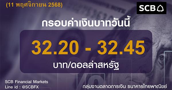 - กลุ่มงานตลาดการเงิน ธนาคารไทยพาณิชย์ ประเมินค่าเงินบาทวันนี้เคลื่อนไหวในกรอบ 32.20-32.45 บาท/ดอลลาร์