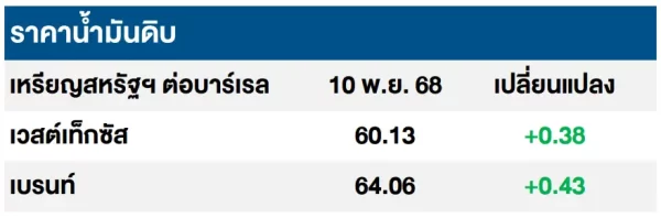 (+) ราคาน้ำมันดิบเวสต์เท็กซัสและเบรนท์ปรับเพิ่มขึ้น หลังสหรัฐฯ สามารถที่จะยุติภาวะปิดหน่วยงานรัฐบาล (Shutdown) ซึ่งดำเนินมากว่า 41 วัน ได้ชั่วคราวจนถึงวันที่ 30 ม.ค. 69 ภายหลังวุฒิสภาได้ลงคะแนนด้วยมติ 60-40 ผ่านการสนับสนุนของพรรคเดโมแครตสายกลางเพื่อยุติการซัดดาวน์ โดยในขั้นถัดไปจะเป็นการเสนอร่างกฎหมายดังกล่าวต่อสภาผู้แทนราษฎรเพื่อขออนุมัติในวันพุธนี้
